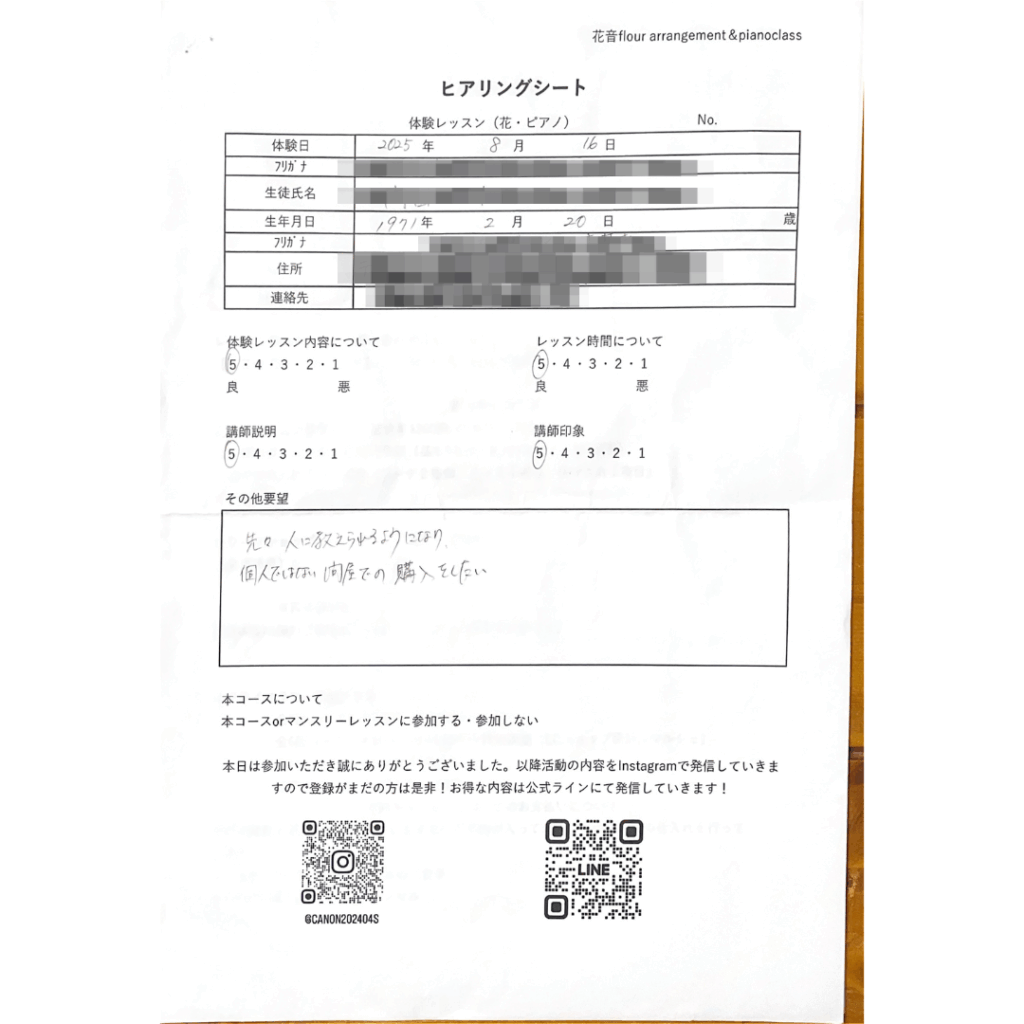 お花のお稽古やワークショップを数々体験しに行きましたが、「肝心なところを教えてくれない」「本当はその作業を私がやって覚えたいのに」とモヤモヤする気持ちになりましたが、花音canonさんでは包み隠さず教えてくれるので入校を決めました。